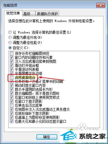 6、选择完成点“确定”,显示器会黑屏一会切换显示效果; 7、这里注意一点:当你关闭“启用桌面组合”显示效果后,那么“启用Aero peek”也就自动关闭了,因为“启用Aero peek”的前提就是先要启用“启用桌面组合”; 当你关闭“启用桌面组合”后,“启用Aero peek”消失了,重新启用“启用桌面组合”才能找回“启用Aero peek”效果。 大家可以先关闭“玻璃效果”看一下,如果显示的问题解决了,就不要关闭“启用桌面组合”了。毕竟关闭了“启用桌面组合”就没法用“Aero peek”效果了;