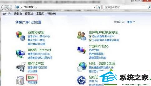 2、在控制面板将查看方式修改为“类别”,然后点击“程序”;