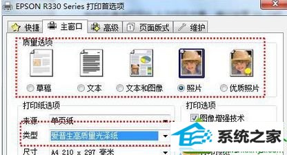 另外还有其他原因也会引起这样的情况,我们可以按照以下设置尝试是否可以解决: 1、依旧在打印机首选项界面的“主窗口”中,选择“照片”,在类型框中选择对应纸张类型!