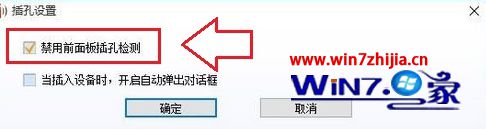4、打开插孔设置后,并勾选“禁用前面板插孔检测”选项,其他选项就不需要勾选,然后确定;
