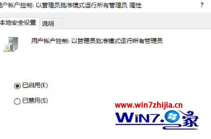 11、双击进入<以管理员批准模式运行所有管理员>配置,将最上方的TAB栏移至说明项,如下图所示,可以看到选项的默认值是哪个,如这个配置的默认为启用,这样即便记不清原始配置也可以按此调整。