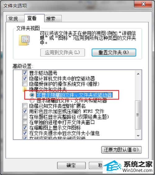 5:第五步将“显示隐藏的文件、文件夹和驱动器”改为“不显示隐藏的文件、文件夹和驱动器”,点击确定,如下图所示: