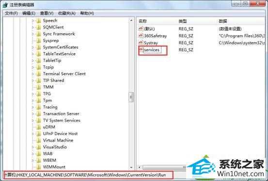 四、接着依次展开HKEY_LoCAL_MACHnE→software→Microsoft→windows→Currentversion→Run,在右边找到services选项并将其删除。如下图所示: