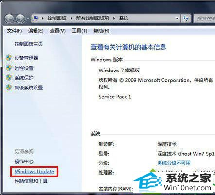 2、来到“属性”界面,直接单击左下角的“windows update”应用选项;